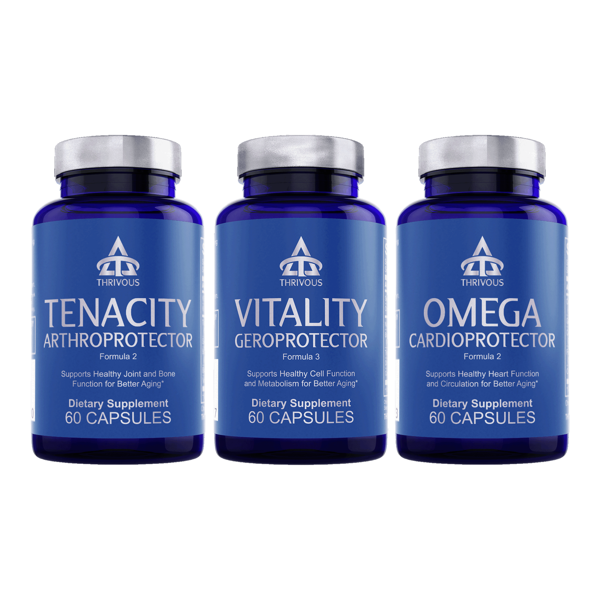 Geroprotector Stack is an advanced supplement to enhance heart, joint, and cell function for better aging. Each is a month supply (180 capsules) of the best natural geroprotectors, with clinical doses of ApresFlex® Boswellia, AvailOm® Omega 3, Berberine, Blueberry, CoQ10, Garlic, Pine Bark, SAMe, Turmeric, and K2 MK7.