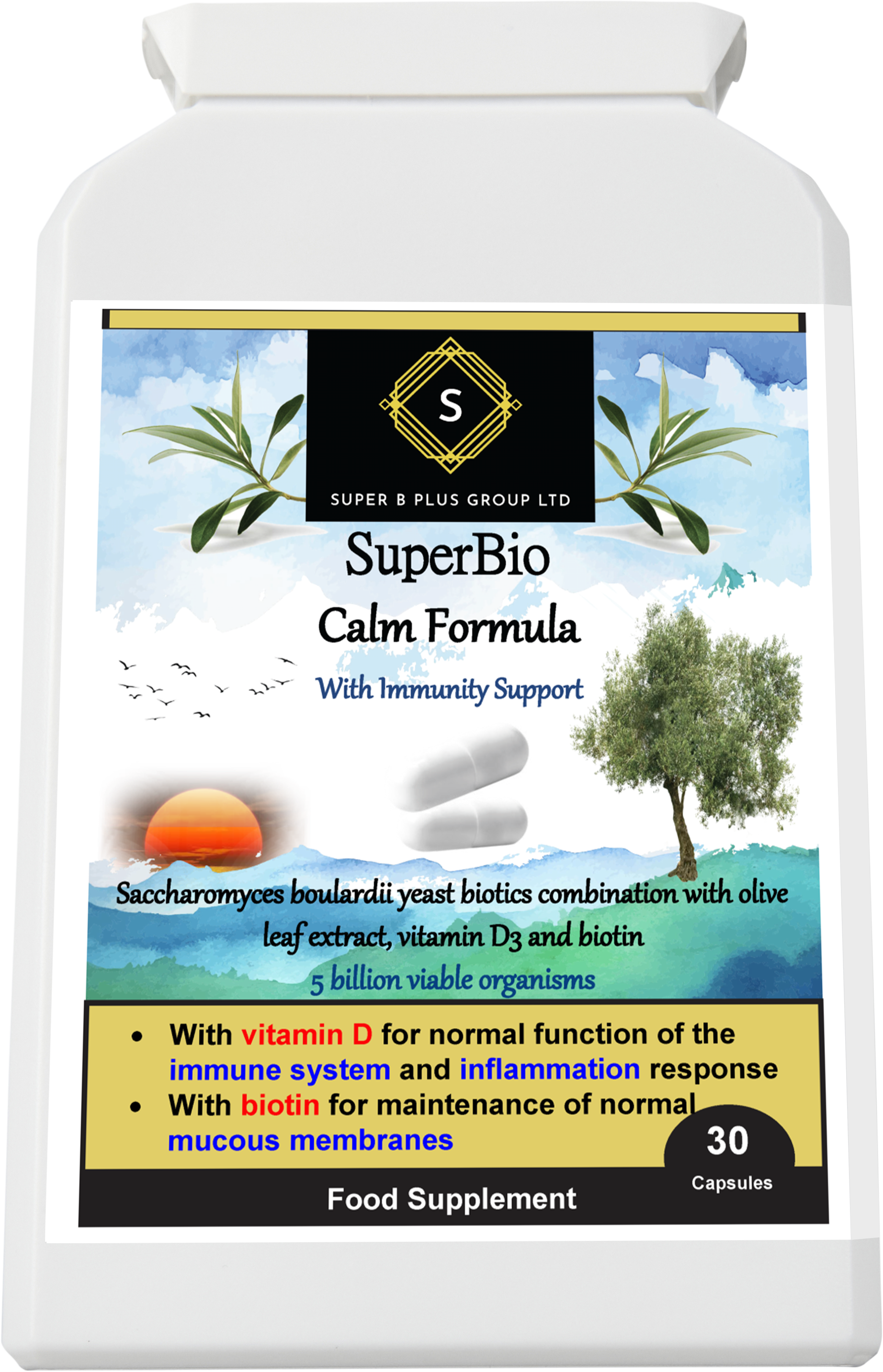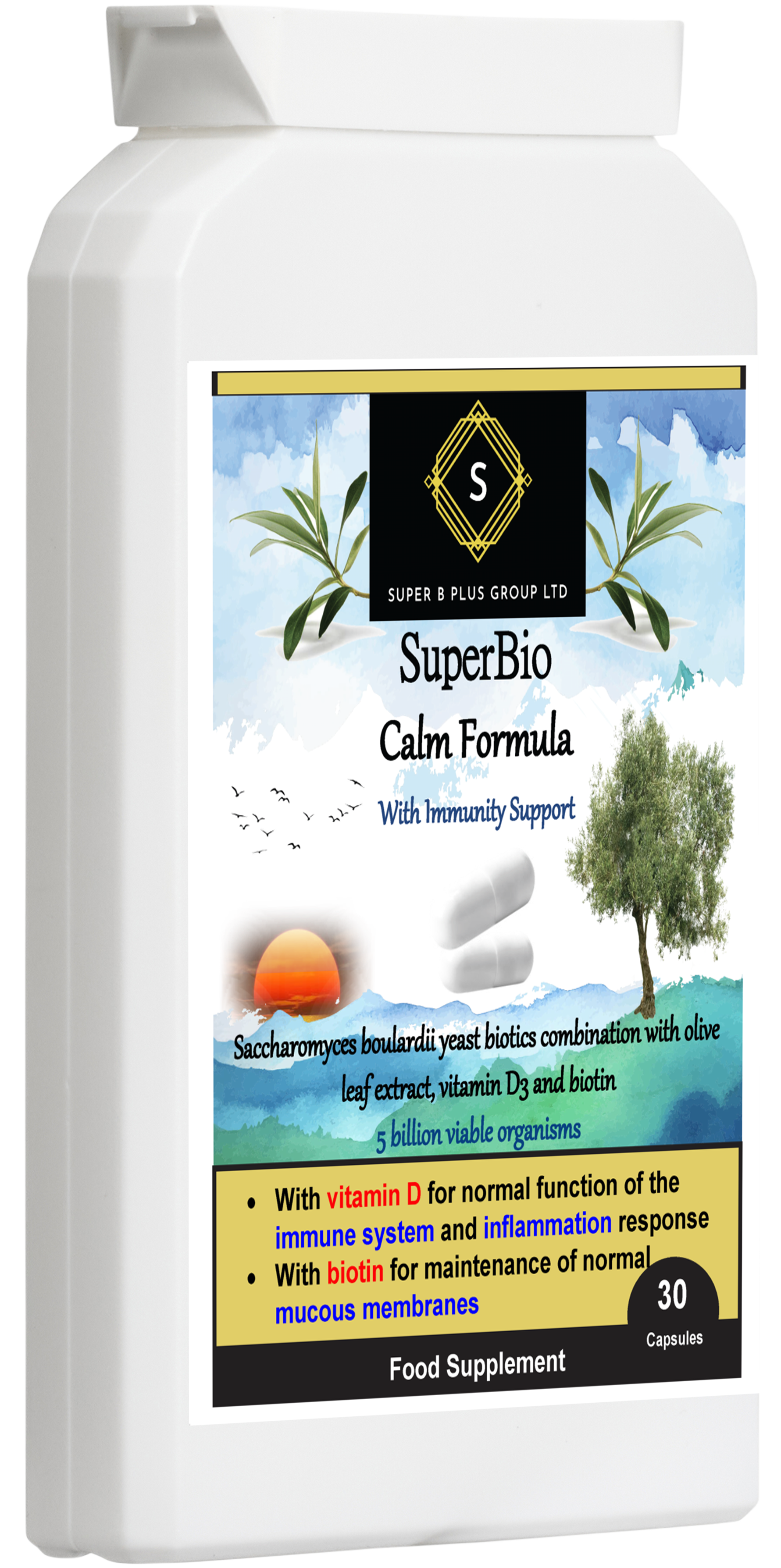 - SuperBio Calm Formula by Super B Plus Group Ltd., combines Saccharomyces boulardii yeast (5 billion strength), olive leaf extract, biotin, and vitamin D for optimal gut health. This powerful blend supports digestion and natural gut bacteria while maintaining a clean gastrointestinal tract and supporting a balanced inflammatory response. Additionally, it provides immune system support, maintains mucous membranes, and supports in energy-yielding and macronutrient metabolism.